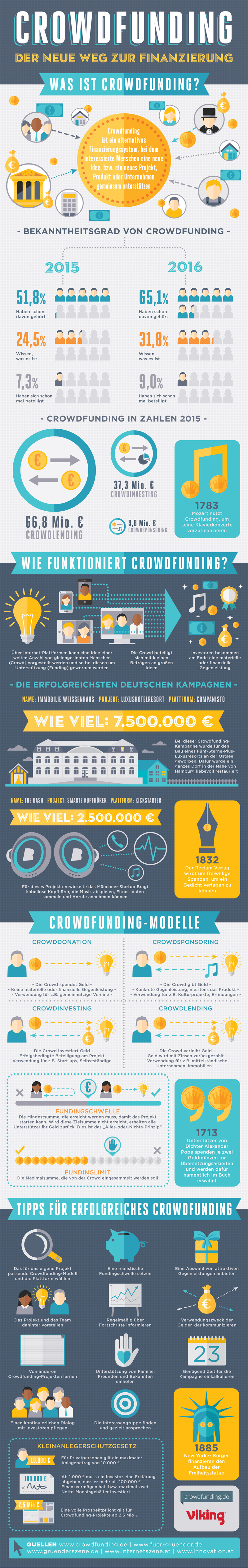 Wörtlich übersetzt bedeutet „Crowd Investing“ so viel wie Finanzierung durch eine Vielzahl kleiner Investoren. Diese Art der Finanzierung wird insbesondere von Gründern und Start-ups verwendet, deren Finanzierungsbedarf für herkömmliche Investoren zu gering ist, die aber dennoch Fremdkapital benötigen. Wie hoch die mögliche Finanzierungssumme ist, hängt vom gewählten Portal ab – während einige den Schnitt bei 100.000 Euro machen, lassen andere Finanzierungssumme von bis zu einer Million Euro zu. Nach einer Prüfung des Konzepts durch die Betreiber wird es auf der Plattform vorgestellt und die Investmentphase beginnt. Ab einem bestimmten Mindestbetrag, der je nach Plattform zwischen 5 und 500 Euro liegt, kann sich jeder registrierte User am Unternehmen beteiligen. Nach dem Ende der Investmentphase wird das Kapital an das Start-up ausgezahlt und die Investoren erhalten einen Beteiligungsvertrag.Infografik: Crowdfunding in Deutschland